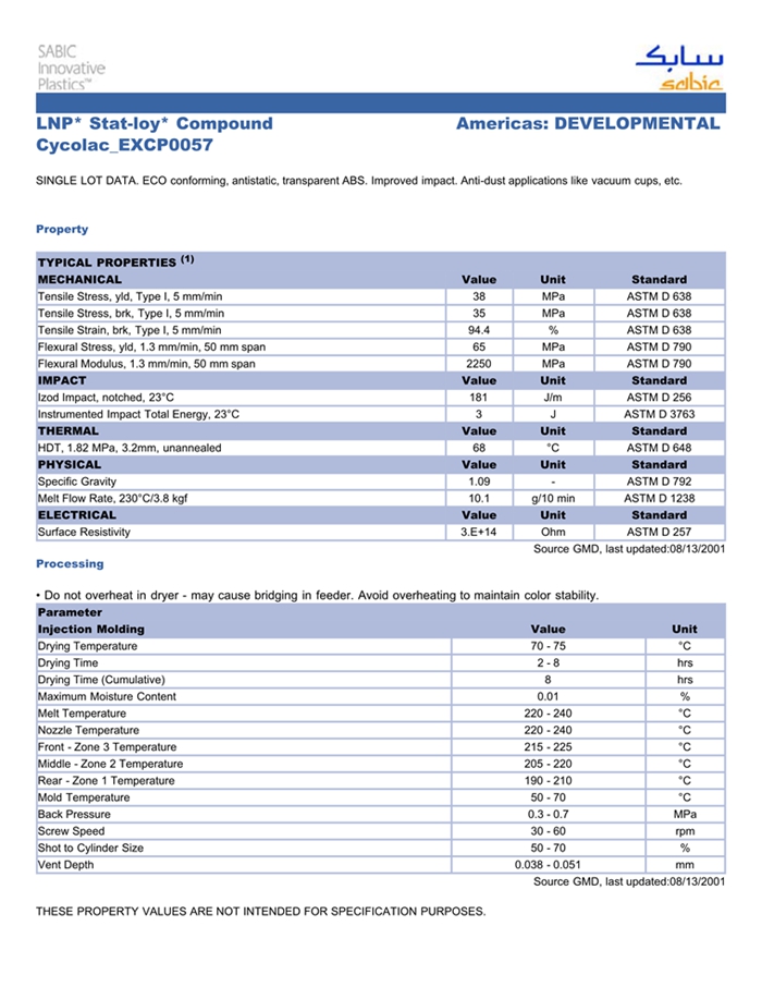 应用范围:产品描述LNP STATLOY Cycolac_EXCP0057物性表SINGLE LOT DATA. ECO conforming, antistatic, transparent ABS. Improved IMPACT. Anti-dust applications like vacuum cups, etc.